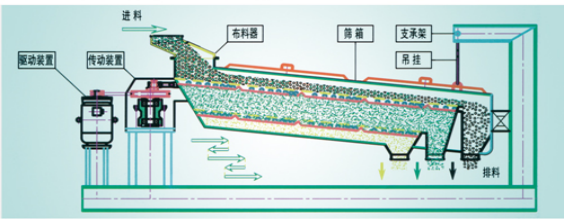 搖擺篩的工作原理為:篩機啟動后,篩體即篩箱在慣性力的作用下作前后往復運動。篩箱帶動篩面作周期性搖動,從而使篩面上的物料隨篩箱一同作定向跳躍式運動,其間小于篩面孔徑的物料通過篩孔落到下層,即為篩下物。大于篩面孔徑的物料經連續翻滾跳躍運動后從排料口排出,**終完成篩分工作。