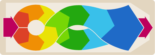 下圖可形象的說明方形搖擺篩是如何改變和控制物料在篩面上的運動軌跡與滯留時間并進一步提高篩分效率。